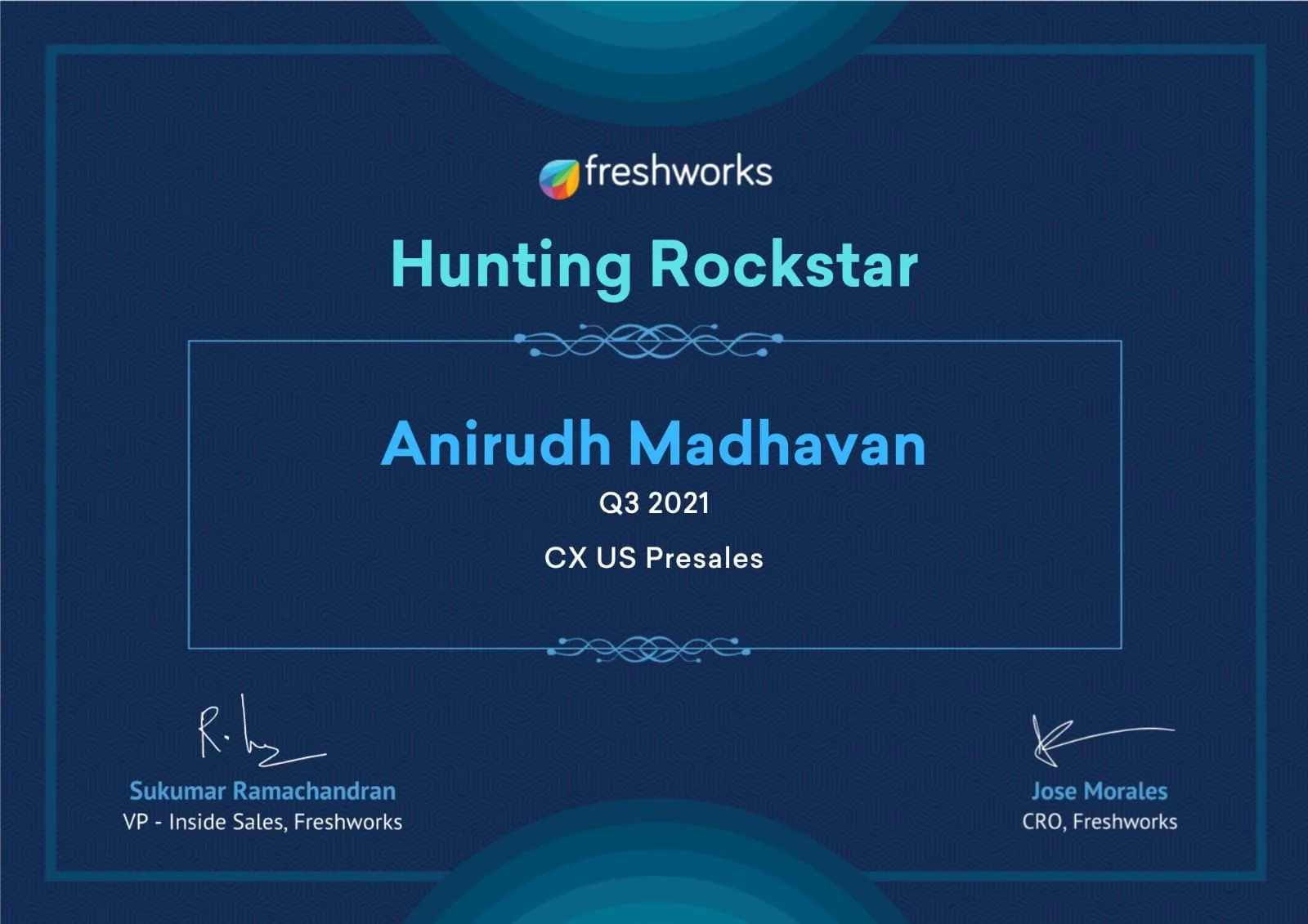 Recognition for significant contributions to revenue attainment in Q3 2021, in the North America CX SMB Division